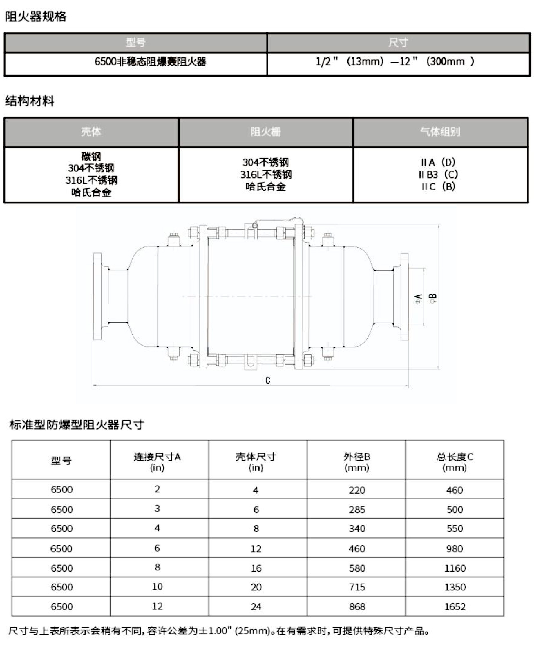 非穩(wěn)態(tài)阻爆轟阻火器主要用于無限制非穩(wěn)態(tài)爆轟。此系列阻火器是雙向構(gòu)造,并經(jīng)試驗驗證,可阻止來自任一方向的、以亞音速或超音速傳播的已點燃的可燃 蒸汽混合氣。