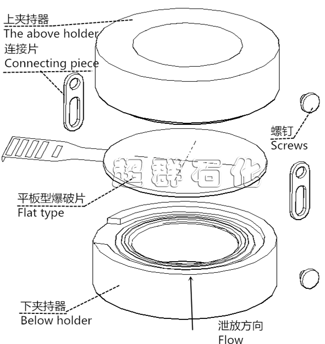 爆破片壓力敏感元件呈平板形。爆破片由周邊透縫(或中心處)及相鄰終止孔間構成的減弱結構控制,爆破沿透縫撕裂形成泄放通道。